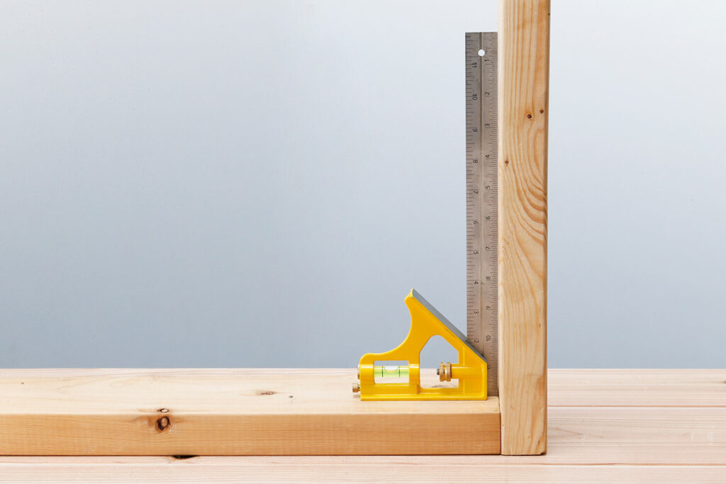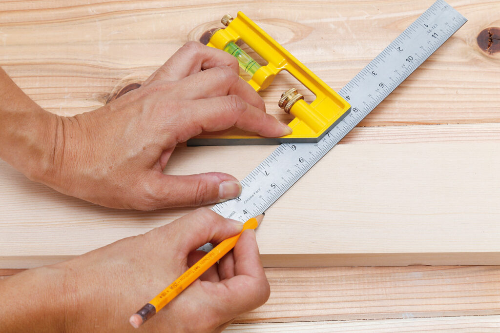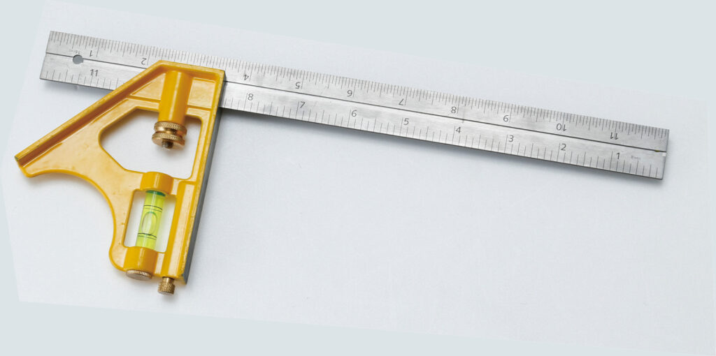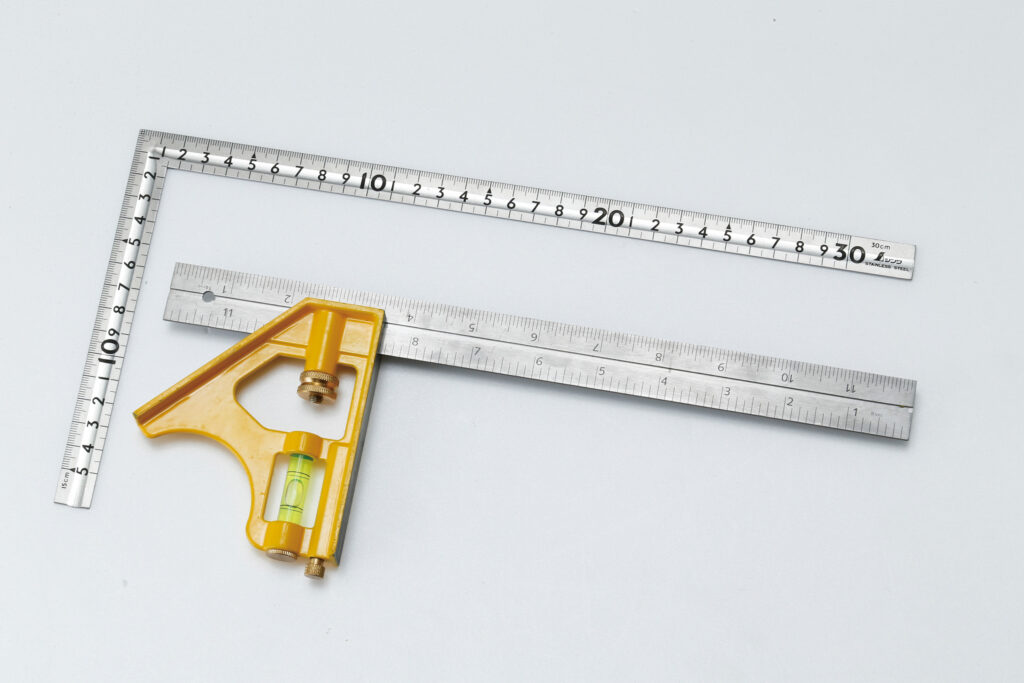 コンビネーション定規は、直角定規と水準器がひとつになった工具。スライド式の本体は、直尺に対して45度と90度の角度を持ち、直尺上の任意の位置で固定して角度定規として使うことができます。水準器を使って、水平出しと垂直出しも可能です。