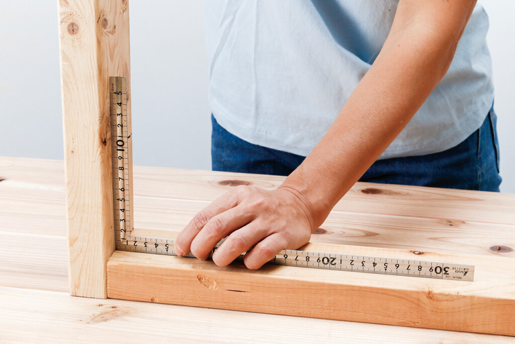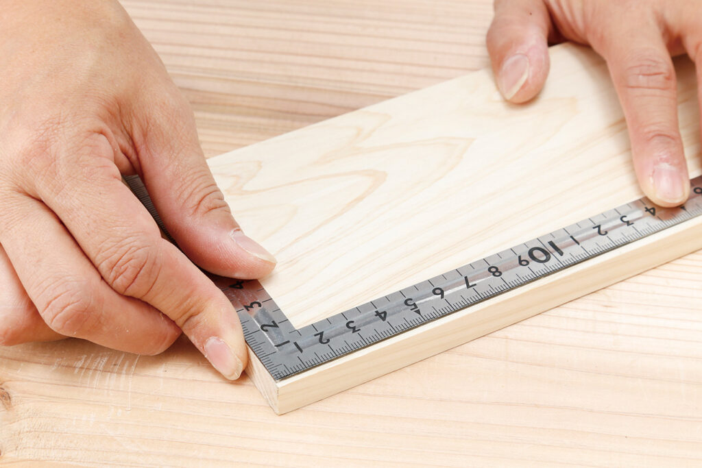 さしがねは、直角に曲がっている金属製の定規です。長さを測ったり、材料に寸法どりをしたりするほか、垂直の線、45度の線、等分の線など、木工で使ういろいろな種類の線を簡単に引くことができます。また、直角や平面の確認に使うこともでき、実に多用途。木工をはじめる際に、用意しておきたい基本工具のひとつです。
