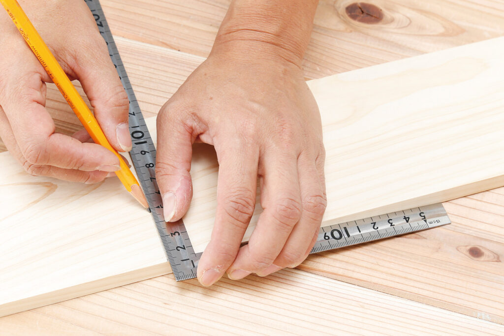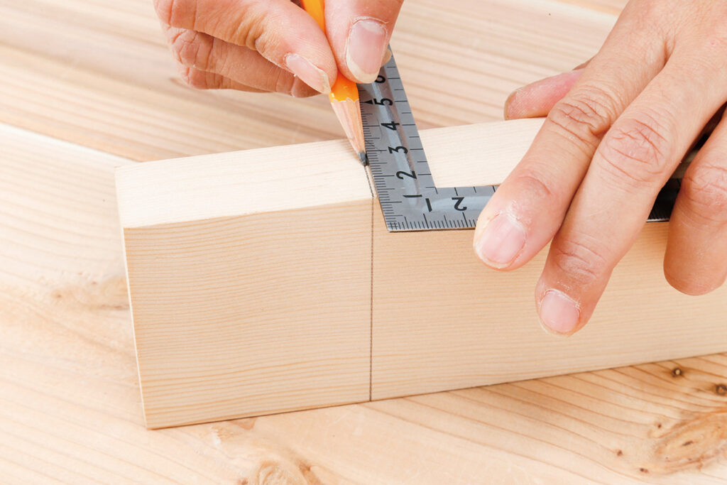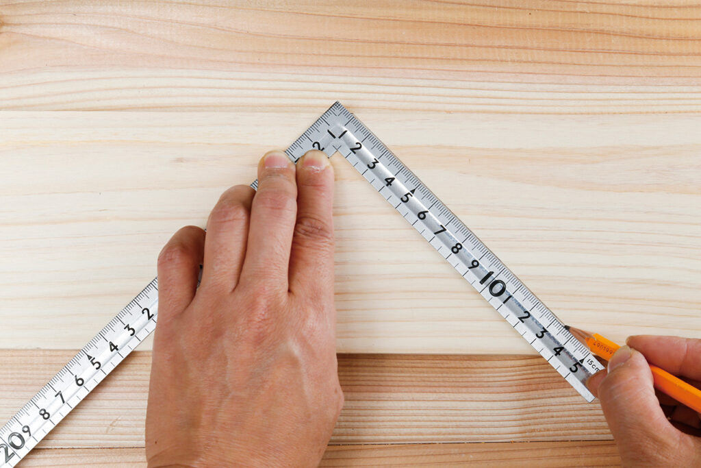 ノコギリで材料を切り落とすときは、2面に線があると切りやすくなります。先に引いた線にさしがねをあわせれば、もう1本の垂直線を簡単に引くことができます。